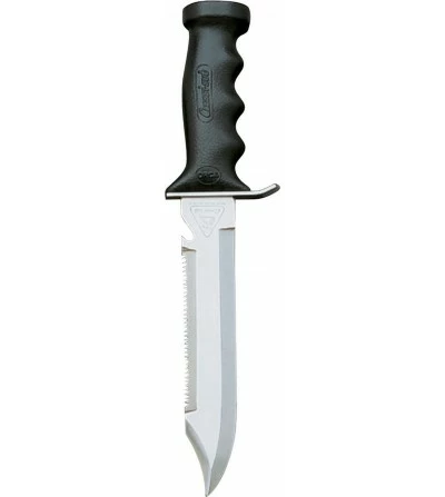 La lame de grandes dimensions, forgée dans un acier spécial, possède un côté lisse et l’autre cranté en scie.